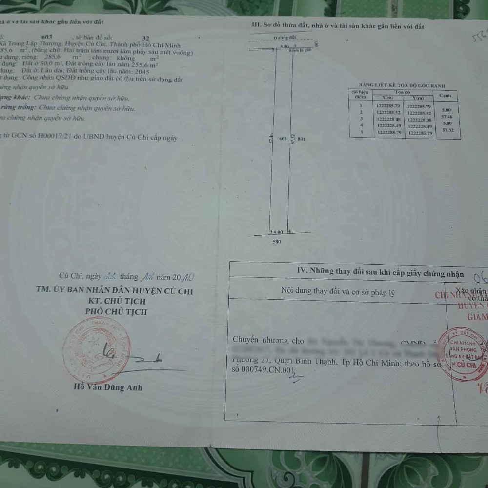 Đất có diện tích 5x57 = 285.6 m2, có 30 m2 thổ cư, có thể lên thổ thêm do đất thuộc quy hoạch khu dân cư hiện hữu.